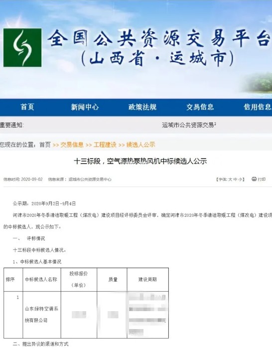 2020年9月2日,山西省運(yùn)城市公共資源交易中心公示了河津市2020年冬季清潔取暖工程(煤改電)建設(shè)項(xiàng)目的中標(biāo)結(jié)果,綠特位列榜單,實(shí)力中標(biāo)。