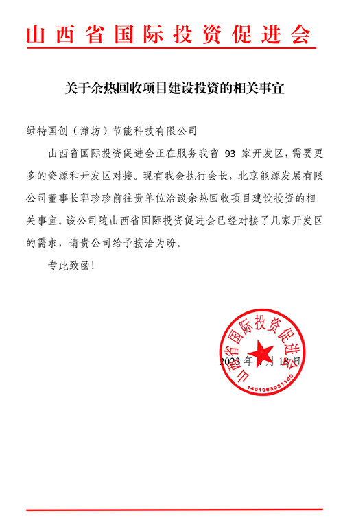 2023年4月20日,山西省國際投資促進(jìn)會(huì)執(zhí)行會(huì)長郭珍珍一行蒞臨綠特國創(chuàng)進(jìn)行考察,綠特國創(chuàng)總經(jīng)理張總、營銷總監(jiān)王總進(jìn)行接待,并陪同參觀考察。