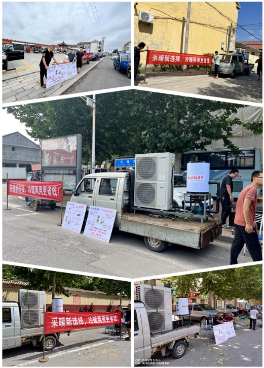 8月伊始,綠特組建熱泵巡展車隊,開啟了下鄉(xiāng)宣傳活動,希望通過此次地推能夠讓夠多的農(nóng)村用戶了解到戶用空氣能熱泵一體機的優(yōu)勢,為取締農(nóng)村燃煤供暖提供新的選擇方案??紤]到鄉(xiāng)鎮(zhèn)村莊較為分散,因此為了能夠?qū)粲每諝饽軣岜靡惑w機起到更好的宣傳,綠特巡展小組選擇在集市上進行展示,從而達到一傳十、十傳百的效果。