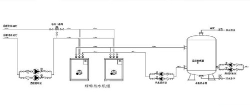 綠特中央熱水機(jī)組的優(yōu)點(diǎn)之一就是在中央熱水機(jī)組內(nèi)部直接進(jìn)行換熱,不用在中央熱水機(jī)組外另加裝換熱器。這樣的結(jié)構(gòu)設(shè)計(jì)使得綠特中央熱水機(jī)組的供熱系統(tǒng)比常規(guī)中央熱水機(jī)組簡(jiǎn)單。并且綠特中央熱水機(jī)組可以?xún)?nèi)里多組換熱器.每組換熱器能設(shè)置不同的溫度的壓力的熱水出水,這樣就能一合中央熱水機(jī)組同時(shí)實(shí)現(xiàn)采暇和衛(wèi)生熱水兩用。